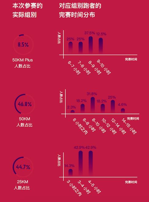 这与大多数参赛选手都使用Keep进行专业训练相互映证,Keep用专业基础训练和日常课程,让越来越多的跑步爱好者迈过了越野赛事的门槛。数据表明最受参赛者欢迎的课程前四名分别是Keep中的HIIT、地狱Burpees、专业燃脂课程和跑步能力核心训练。 三、参赛选手成绩集中在中段,还有一定的提升空间 由于本次因天气原因100km跑被迫取消,组别数据显示绝大多数参赛者选择了传统的50km越野和更少的25km赛程,合计超过90%的比例,而新设置的50 kmplus赛事火热程度不够。