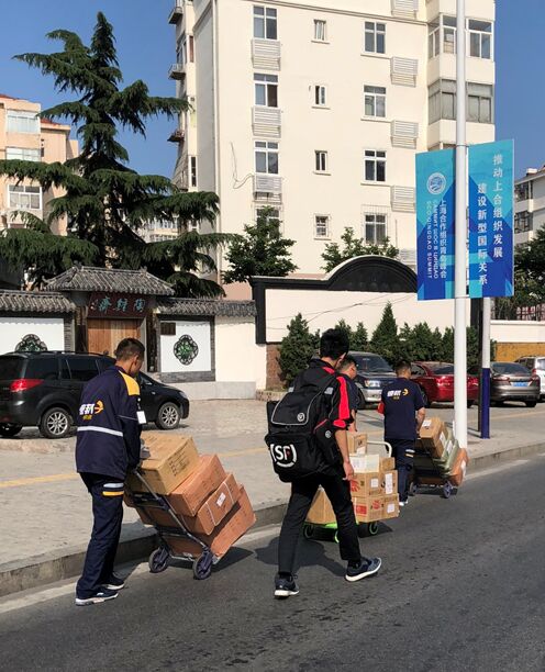 众所周知,国际会议期间,安保工作是重中之重。为了峰会的顺利召开,会议期间,青岛市区限制了电动三轮车的通行。但同时,也给各个快递公司的快递小哥增添了一点的工作强度。 这不,很多快递公司都已车辆限行为由,暂停了快递派送业务,不过,顺丰和德邦快递这两家公司业务依旧如常,不同的是,以往的快递靠车送,会议期间的快递靠人推。 是的,没有电动三轮,顺丰和德邦快递的小哥就把物品放在手推车上,徒步穿梭在整个青岛市区,按时派送快递。