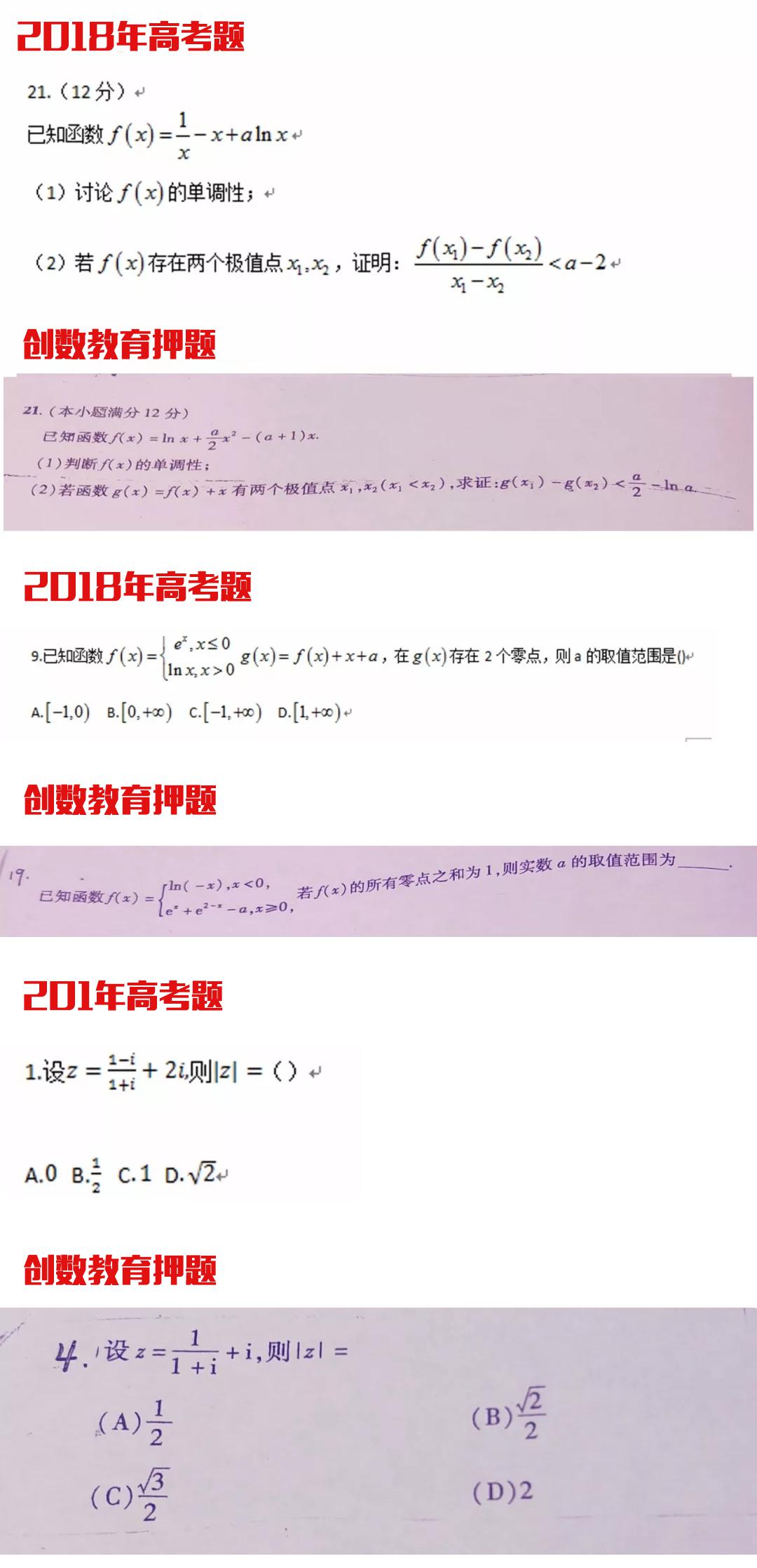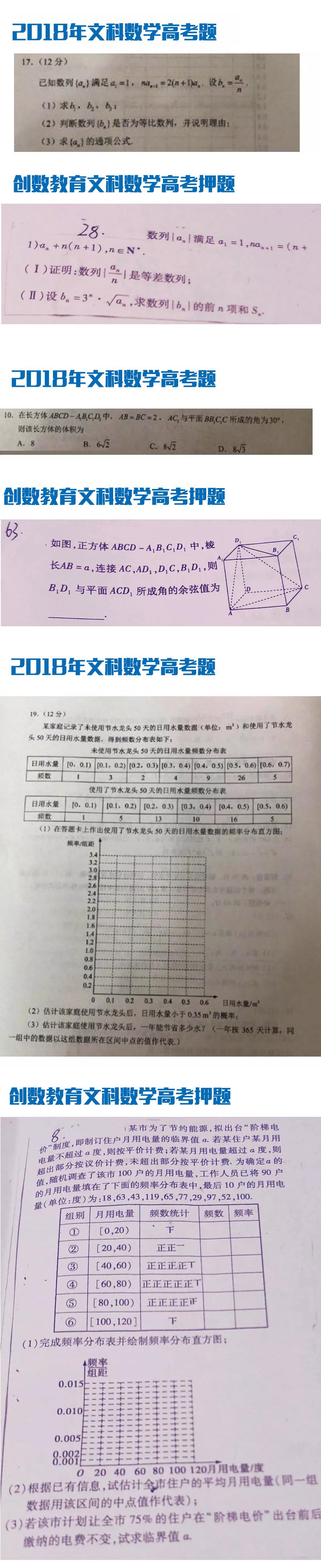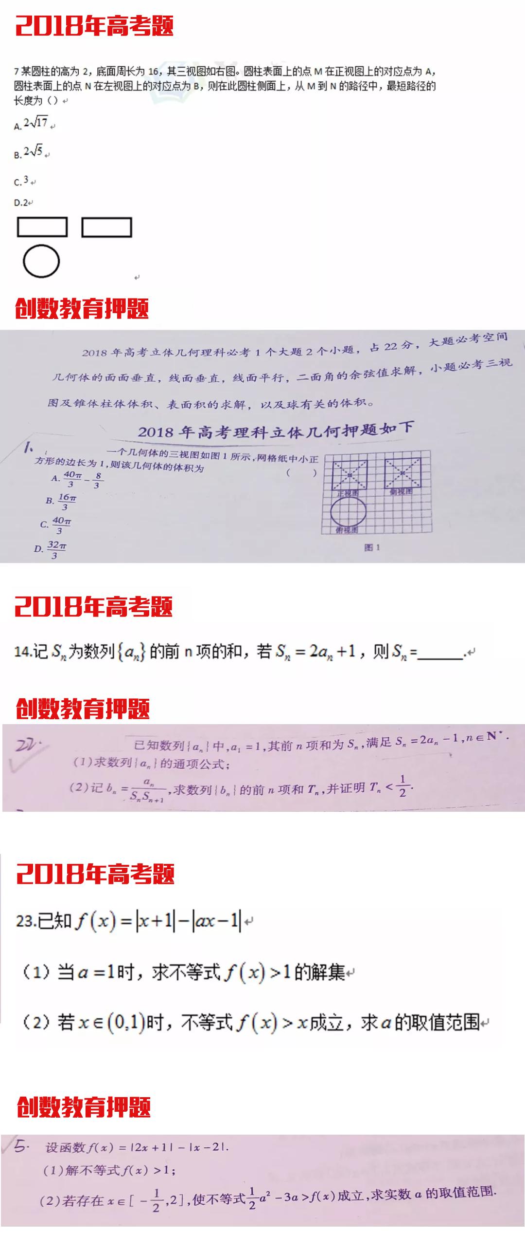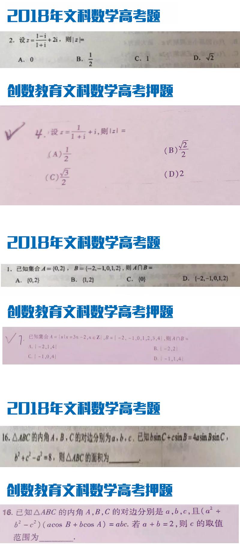 北京创数教育做为国内专注高中数学人工智能助教服务的专业机构,2018高考数学押题再造奇迹,文理科各押题14道,押题分数分别接近百分。 创数教育2018年高考理科押题