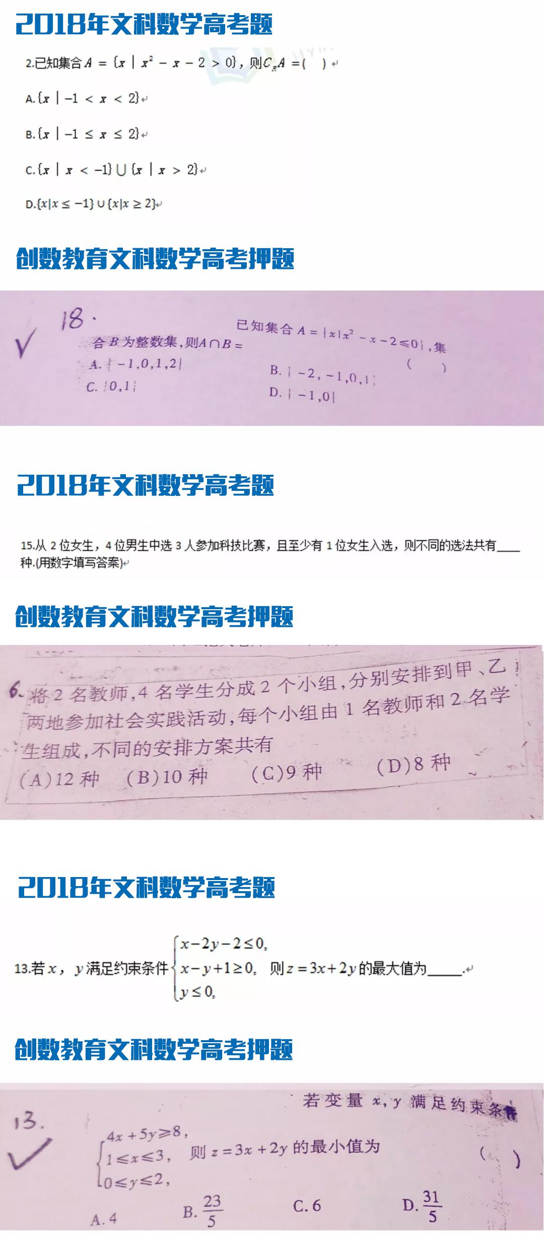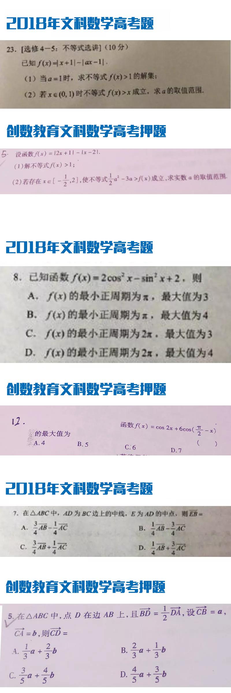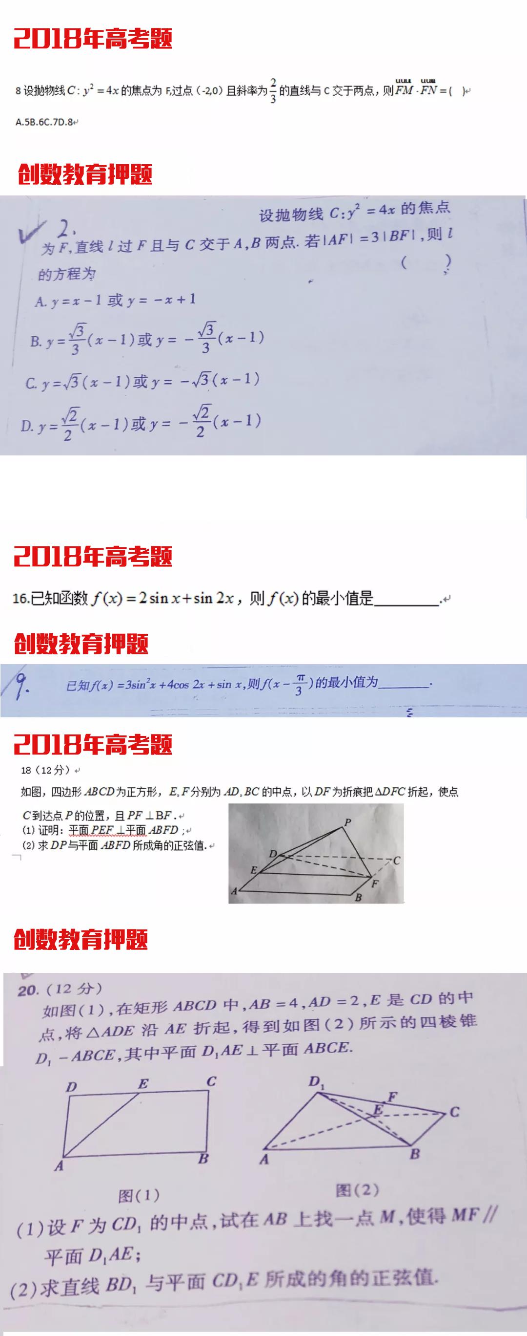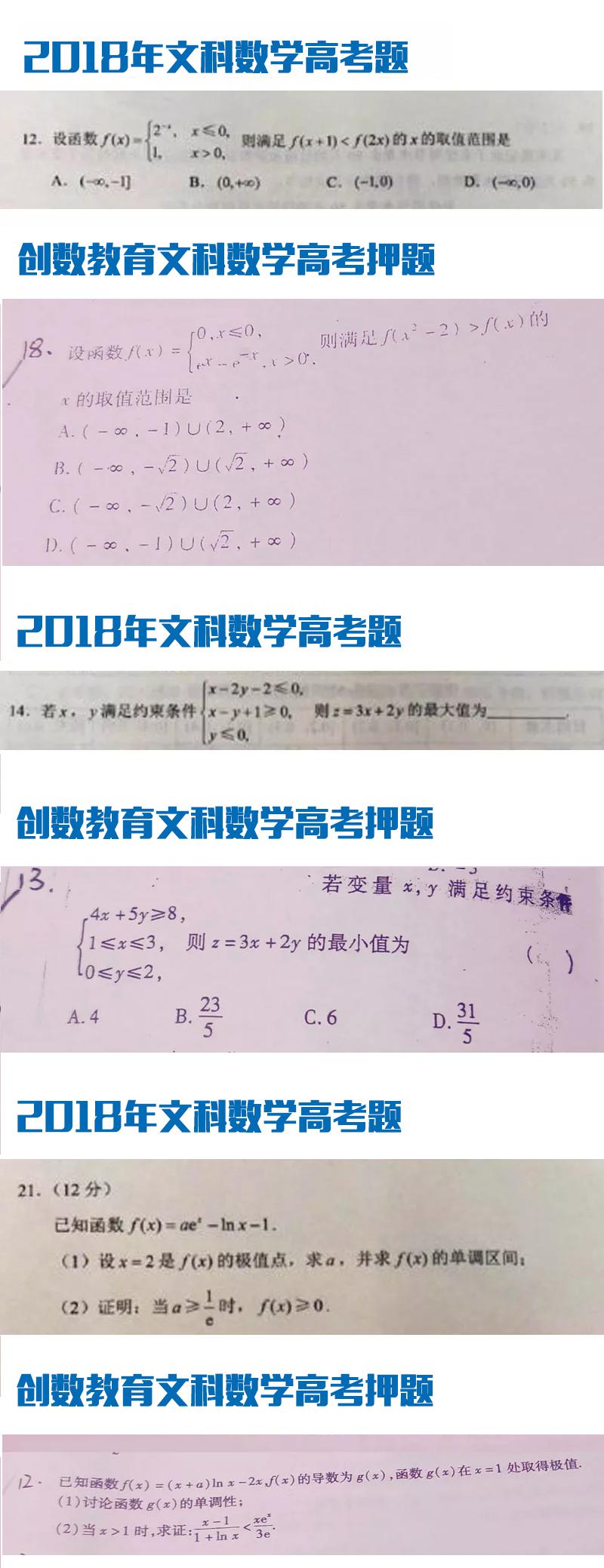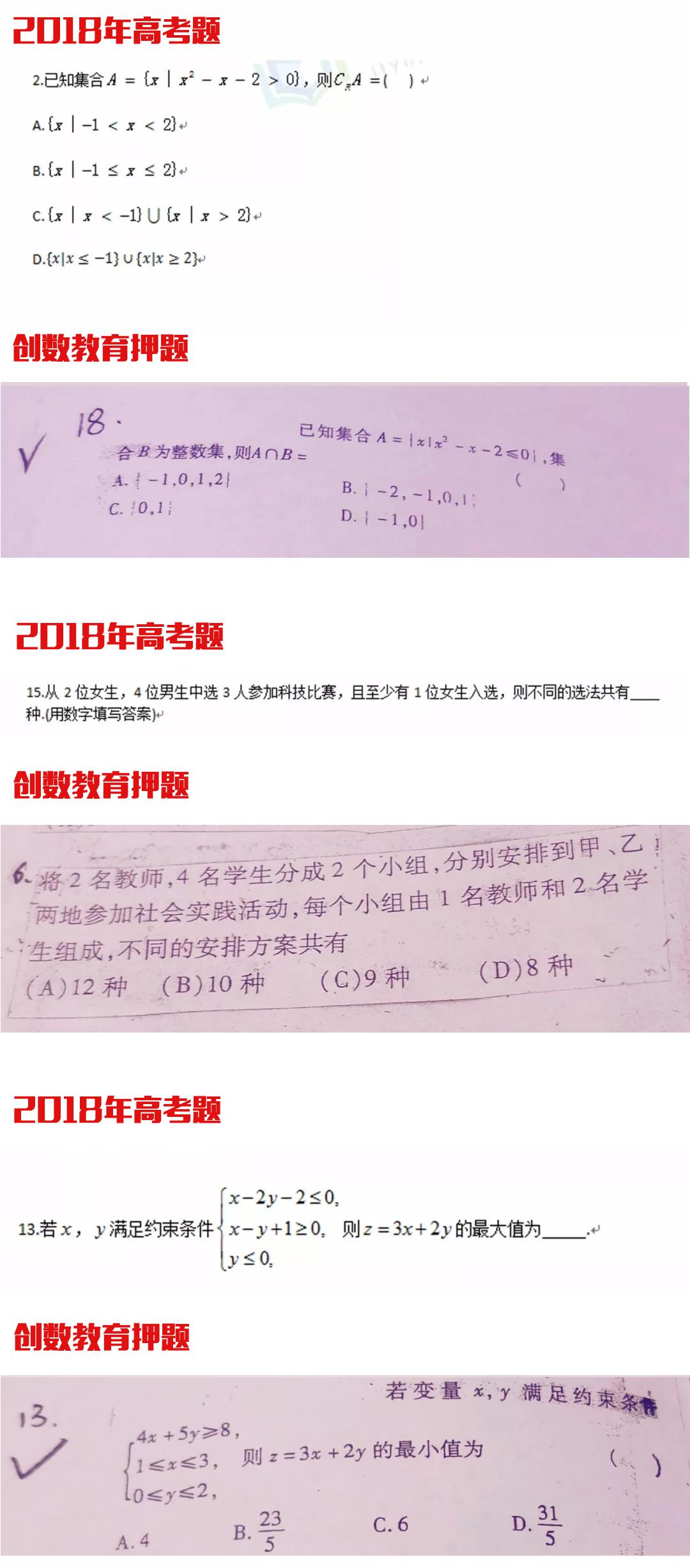 北京创数教育做为国内专注高中数学人工智能助教服务的专业机构,2018高考数学押题再造奇迹,文理科各押题14道,押题分数分别接近百分。 创数教育2018年高考理科押题