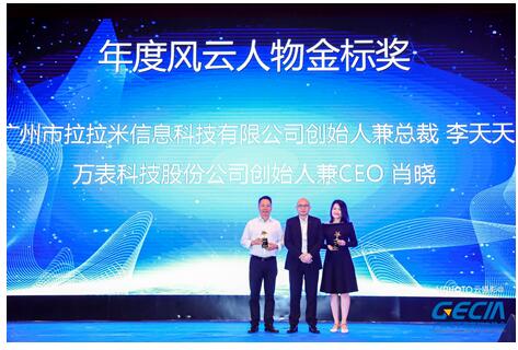 获奖企业合影留念 2018“年度风云人物”:广州市拉拉米信息科技有限公司创始人兼总裁李天天、万表科技股份公司创始人兼CEO肖晓。