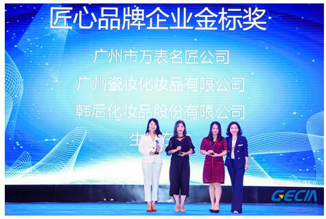 获奖企业合影留念 2018年度“匠心品牌企业奖”:广州市万表名匠公司、广州瓷妆化妆品有限公司、韩后化妆品股份有限公司、广州市生活在左服饰有限公司。