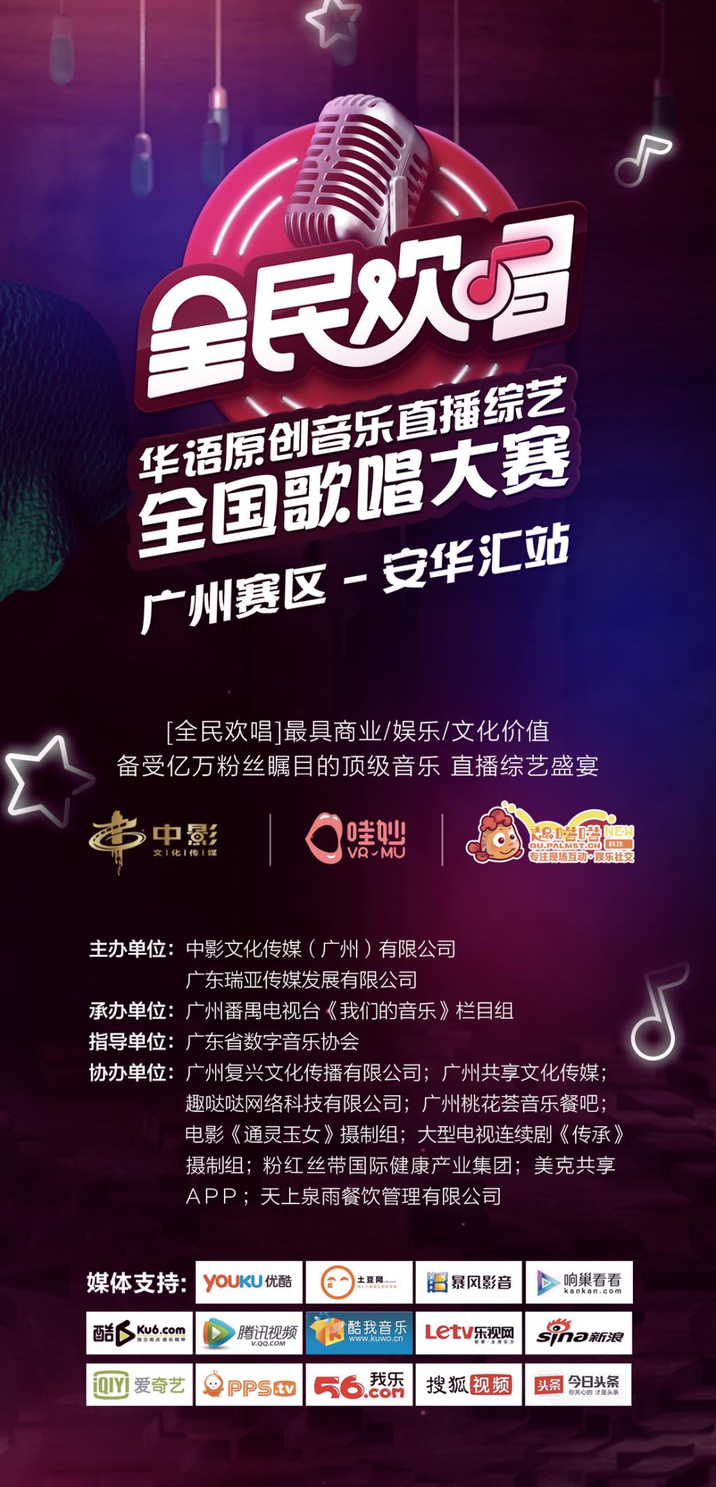 《全民欢唱》是由中影文化传媒与哇妙娱乐平台联合打造、广东省数字音乐协会作为指导单位的一档全民参与、深度互动的华语原创音乐直播综艺节目。对于草根音乐爱好者来说,这档节目不仅是梦开始的地方,也是实现星梦的极速造星平台!