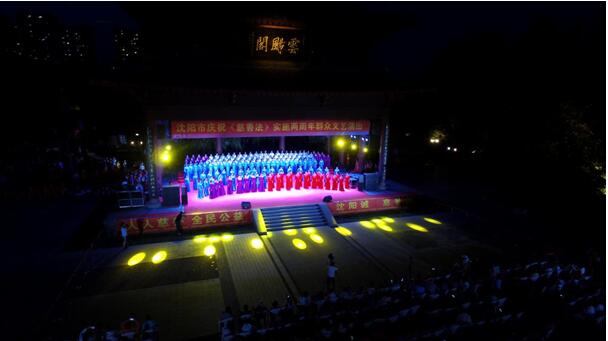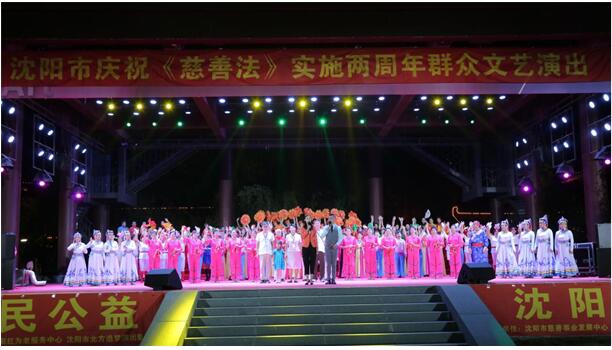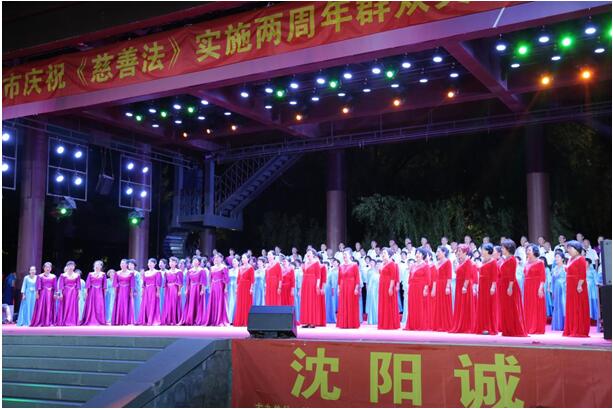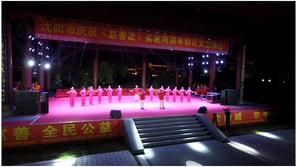 9月1日晚,沈阳市庆祝《慈善法》实施两周年群众文艺演出在沈水湾公园云飏阁举行。