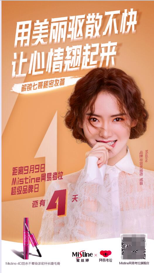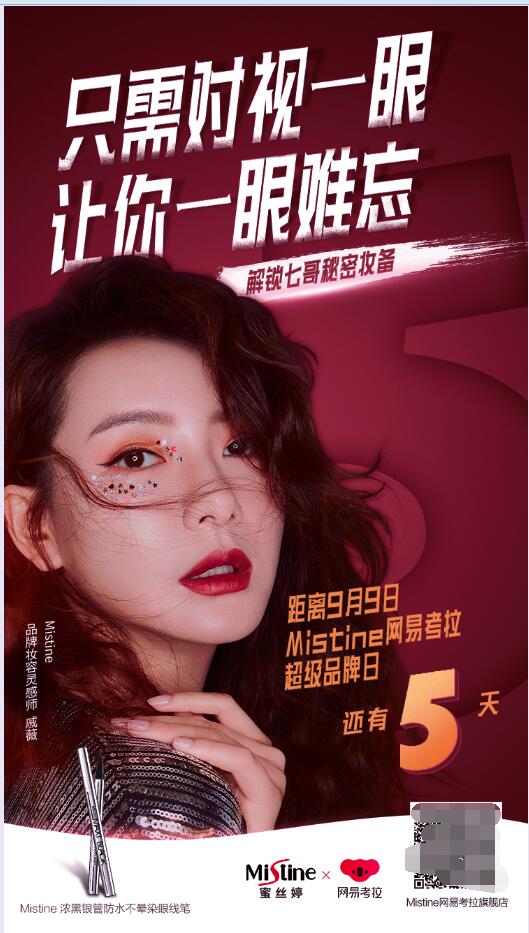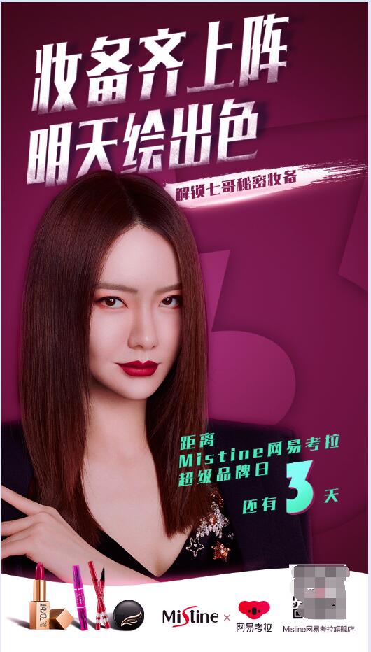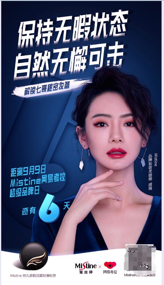 明星流量加持,强势助力品牌发声 明星代言已成为营销的老套路,但此次Mistine联合网易考拉超级品牌日却玩出了新花样;在活动中Mistine携手大众女神戚薇共同演绎“妆备不凡,出色由我”,作为此次活动的“品牌妆容灵感师”,戚薇在活动之初便以一组海报为自己的出色时刻倒计时,邀请粉丝们一起解锁自己的秘密“妆”备,引得粉丝们的共鸣并极力追捧,在为粉丝们安利之余,明星的加持着实带动了品牌的影响力和宣发力,为后续引爆活动销售蓄势蓄力。