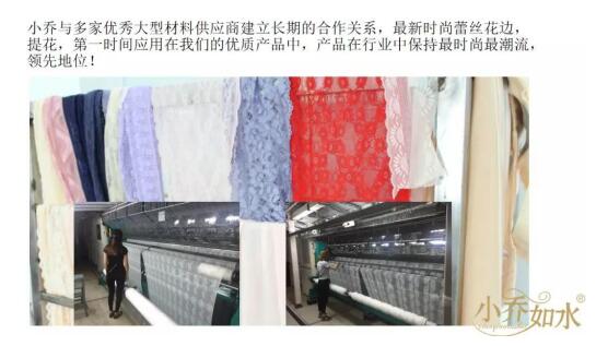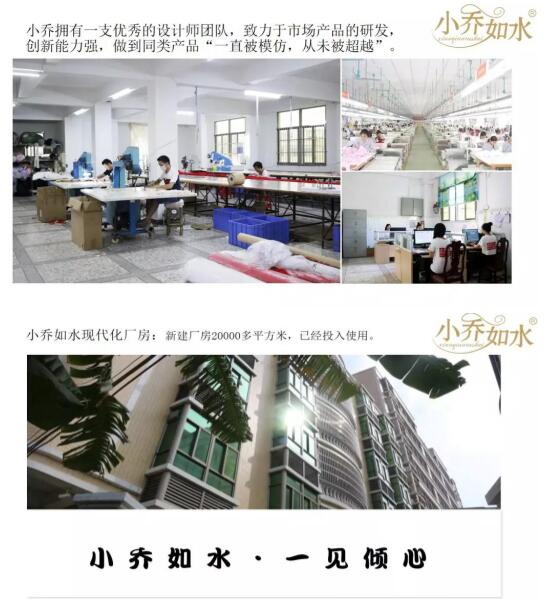 小乔如水(深圳)服饰有限公司创建于2009年,旗下珠雅琪内衣厂是一家集设计、生产、销售为一体的内衣企业。专注调整型、无钢圈内衣、无痕半件围、一片围、保健养生睡眠无胶骨内衣的生产和研发。 公司目前拥有两大生产基地,共8000多平方米的现代化厂房,旗下拥有两大品牌“小乔如水”、“珠雅琪”,产品在市场上享有良好的口碑!
