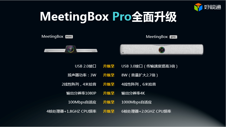 11月27日,齐心好视通“智无界·新跨越”新品发布会在齐心集团深圳坪山总部隆重举行。齐心集团高管、媒体记者及投资机构人士共同见证了齐心好视通新品发布。本次发布会发布的新品包括“好视通一体化云会议终端MeetingBox Pro”和“好视通微信小程序”。 发布会开始,齐心集团副总裁兼银澎云计算执行总裁侯刚首先发表致辞。他说到,随着云计算和大数据技术的快速发展,云视频会议这种让更简单、更高效的协作方式越发受到众多企业青睐。经过9年多的飞速发展,齐心好视通已拥有300多人精英研发团队、18个办事处、80多项专利技术、500多个产业链合作伙伴,业务范围覆盖云视频会议、智慧教育、智慧党建、智慧医疗、等产品线。产品被广泛应用于企业、政府、军队、医疗、教育、金融等各个行业领域,在全球市场获得了超过6万家企业用户的高度认可与信赖。在近期权威数据机构IDC发布的云视频会议市场报告中,齐心好视通连续两年荣获国内市场占有率第一、增长率第一的位置。 侯刚表示,“好视通一体化云会议终端MeetingBox Pro”和“好视通微信小程序”这两款新品的面市将进一步提升齐心好视通在市场上的竞争优势,为公司未来的发展增添新动力。 据了解,本次发布的好视通一体化云会议终端MeetingBox Pro是在MeetingBox的全面升级。MeetingBox Pro除了具备全终端跨平台接入、音视频AI声源自动定位跟踪、AI人脸识别、智能语音翻译、多种入会方式等强大功能以外,对中央处理器、USB接口、扬声器、输出分辨率等重要模块进行了全面升级,其中处理器由4核+1.8GHZ CPU频率升级至6核+2.0GHZ CPU频率、USB接口由2.0升级至3.0(传输速度提高3倍)、扬声器功率由3W升级至8W(音量扩大2.7倍)、输出分辨率由1080P升级至4K。