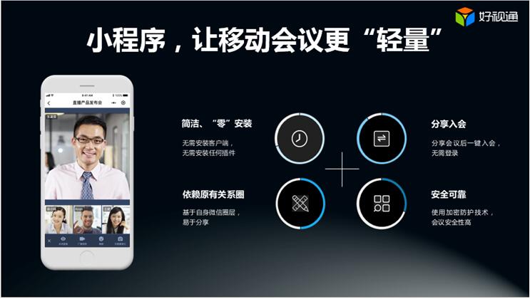 MeetingBox Pro硬件性能全面升级 硬件性能全面升级后的MeetingBox Pro将更好地服务于企业日常会议、远程教育培训、视频直播、智慧教育、远程医疗示教、远程应急指挥等场景,为用户带来更优质的使用体验。 发布会的另一重要产品——好视通微信小程序是齐心好视通云视频会议平台的微信入口,通过好视通微信小程序,用户无需下载APP就可轻松使用齐心好视通云视频会议产品,具有即用即走随手可得、多端兼容、可分享可传播、操作体验好等优点。更重要的是,以微信作为连接器开发的好视通微信小程序还可分享微信10亿庞大的用户流量红利,未来通过开发合作,能赋能更多行业服务拓宽入口,更进一步触达用户。