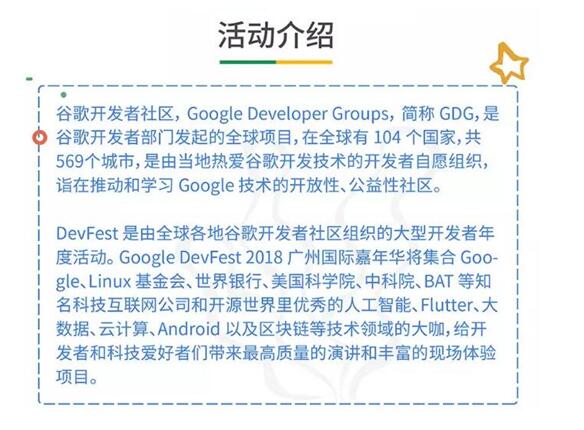 GDG Developers Groups-谷歌开发者社区(简称GDG),是谷歌开发者部门发起的全球项目,曾先后在全球有104个国家,共569个城市举办,是由当地热爱谷歌开发技术的开发者旨在推动和学习 Google技术的开放性、公益性的嘉年华活动。
