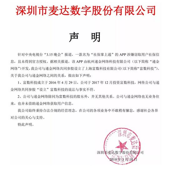 3月18日上午,麦达数字在公司官网对媒体和舆论胡乱猜测公司与315涉事公司杭州递金网络科技有限公司存在关联的情况进行了澄清。 麦达数字在申明中表示,针对中央电视台“3.15晚会”报道,一款名为“社保掌上通”的APP涉嫌窃取用户社保信息,且未得到官方授权。据相关报道,该APP由杭州递金网络科技有限公司(以下简称“递金网络”)开发,我公司与递金网络共同参股设立了上海富数科技有限公司(以下简称“富数科技”)。关于我公司与递金网络之间的关系,做出如下声明: 1、富数科技成立于2016年4月29日,公司于2017年12月投资富数科技,网传公司与递金网络共同参股“设立”富数科技的说法与事实不符; 2、公司与递金网络除同为富数科技的股东外,并无其他关系。公司与递金网络也无业务往来,也并未借助递金网络获取用户信息。 麦达数字始终秉持合法合规的经营理念,在公司的各项业务中不敢稍有懈怠。