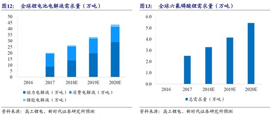 5月8日,财政部、工业和信息化部、交通运输部、国家发改委联合发布《关于支持新能源公交车推广应用的通知》,明确地方可继续对购置新能源公交车给予补贴支持,为新能源汽车推广再次注入一针强心剂。而作为新能源汽车动力电池重要原材料的电解液溶剂产品价格上周继续调涨1000元/吨左右,六氟磷酸锂价格也有所回暖。 锂电池由正极材料、负极材料、隔膜、电解液和电池外壳组成。六氟磷酸锂作为锂电池电解液的重要电解质盐,是生产锂离子电池电解液的主要成份,是锂离子电池核心材料之一。受新能源汽车补贴下降和产能过剩等因素影响,近两年六氟磷酸锂的价格一直在低位徘徊,但最近不少机构认为,在支持新能源汽车发展的大背景下,六氟磷酸锂的价格有望走出底部企稳回升。 新时代证券:2018-2020年六氟磷酸锂复合增速将达32% 六氟磷酸锂作为锂电池电解液的重要电解质盐,是生产锂离子电池电解液的主要成份,是锂离子电池核心材料之一,其产品质量决定了锂离子电池充放电性能、使用寿命和安全性,六氟磷酸锂成本约占整个电解液生产成本的30-40%。产品要求其具有很高的纯度(通常要不低于99.5%),其中的杂质例如水分,碱金属,重金属以及其它杂质如PCl3和POCl3的含量必须严格控制,否则将导致电池内阻增大,电池容量衰减快,循环寿命缩短,甚至影响电池的安全性。