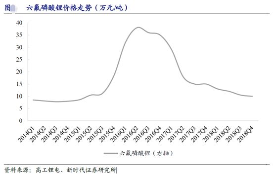 我国是全球最大的新能源汽车市场,也是增长最快的市场,是推动全球新能源车市增长的主要动力。2017年,我国新能源汽车渗透率已达到2.69%,2018年渗透率超4%。这一数据提升的背后,显示出汽车产业新旧动能的加速转换和中国汽车工业的加速转型,汽车电动化趋势日趋明朗。新时代证券预计2018-2020年全球新能源汽车产量分别为219.5、304.4和428.0万辆。新时代证券预计2018-2020年全球锂电池对应电解液需求量分别为24.64、32.00和42.91万吨,2018-2020年复合增速达到32%;其中汽车动力锂电池电解液需求分别为12.80、19.17和28.81万吨。随着电解液需求快速增长,预计2018-2020年全球六氟磷酸锂需求分别为3.08、4.00和5.36万吨,2018-2020年复合增速达到32%。 六氟磷酸锂价格已见底回升 上市公司受益 高工锂电数据显示,作为锂电池电解液原料的六氟磷酸锂,价格自2015年下半年起开始快速上涨,仅几个月的时间就涨至40万元/吨。进入2016年,随着国内六氟磷酸锂企业扩产,六氟磷酸锂价格相对趋稳。2017-2018年随着新产能释放,六氟磷酸锂价格出现较大程度的下降,最低时跌至低于9万元/吨。2018年底,受主要原材料氢氟酸涨价,同时部分六氟磷酸锂企业开工率不足,市场供给紧张的影响,六氟磷酸锂价格已探底回升。光大证券统计2019年行业内新增产能在1.3万吨左右,能够基本平衡新增需求,产能利用率维持在七成五左右,六氟磷酸锂的价格有望走出底部区间。