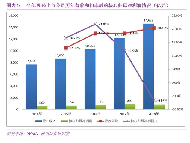 2018年A股年报披露工作已经收官,各个行业的年报梳理工作也陆续公布。生物医药行业2018年因为行业政策不断而受到市场关注,那么上市公司到底交出了怎样的年报成绩单呢?统计数据显示,2018年医药生物整体营收总额同比继续稳定快速增长(+20.45%),但归母净利润972.8亿元,扣非归母净利润832.9亿元,分别同比下降9.66%和6.57%,利润增速显著低于营收增速,并且双双创下近5年来的低点。在这样的背景下,实际应收和利润增速继续保持稳健增长的公司自然会受到更多的关注。 医药行业2018年利润增速创5年新低 联讯证券认为2018年生物医药行业营收端增速较快,主要是由于两票制影响药械出厂价低转高开影响,利润端负增长主要是费用增加(尤其是研发费用)、公允价值和资产减值等因素影响。拉长年度周期观察二者趋势,近四年营收增速逐年加速,而扣非后的核心业务净利润则从2016年开始逐年下滑,2017年大幅下滑近10pct,2018年则增速跌入负值。