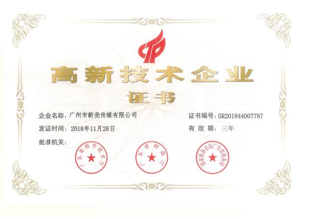 近日,全国高新技术企业认定管理工作领导小组办公室对广东省2018年认定高新技术企业名单进行了公示。其中,广州市新尧传媒有限公司(以下简称“新尧传媒”)正式通过国家级高新技术企业认定,这标志着新尧传媒的企业技术实力和科研成果获得国家认可,正式迈入国家高新技术企业行列。
