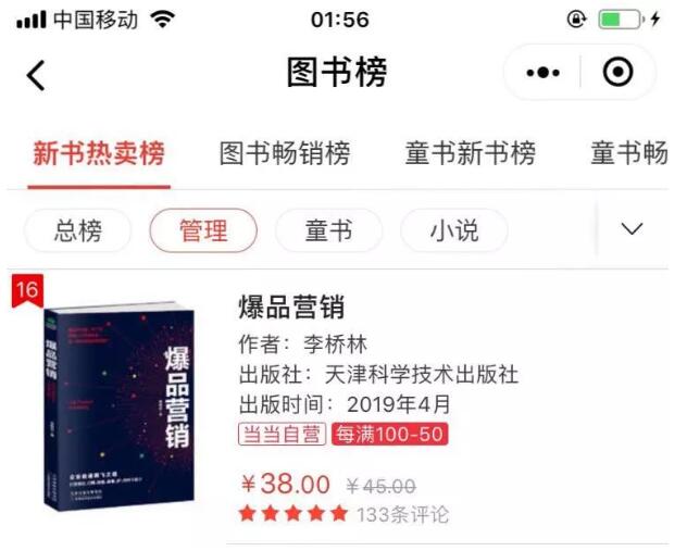 成功新华作为该书的发行商,他们曾经成功运作了上百万册的书,他们对爆品营销信心十足,直接签订了包销5万册的合同。这在策划界是绝无仅有的事情,其实,策划类书籍要畅销好像基本无缘,凡是资深的策划人都写过书,但书能发行销售3000本就很不容易了,很多专家的书印刷才1000本,能登上排行榜更是寥寥无几。2019年5月29日,《爆品营销》出版仅30天荣登当当网新书排行榜16名,据发行方介绍目前已经销售出约5000本,首印2万册,预计6月底第二次印刷。