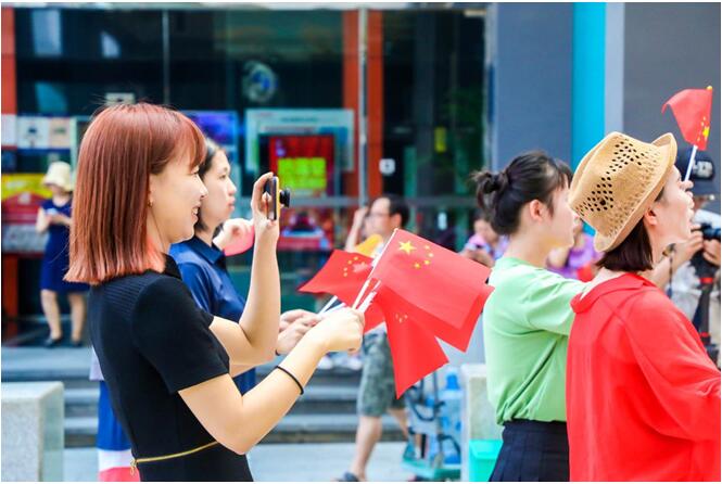 他们手持国旗,神采洋溢,在激昂的乐曲中,满怀自信地唱出对祖国的热爱,还吸引来周围的路人驻足、加入,共同的歌声与掌声中,抒发爱国情,讴歌新时代。这种自信来自70年的不懈拼搏,来自创业浪潮里的奋勇搏击。
