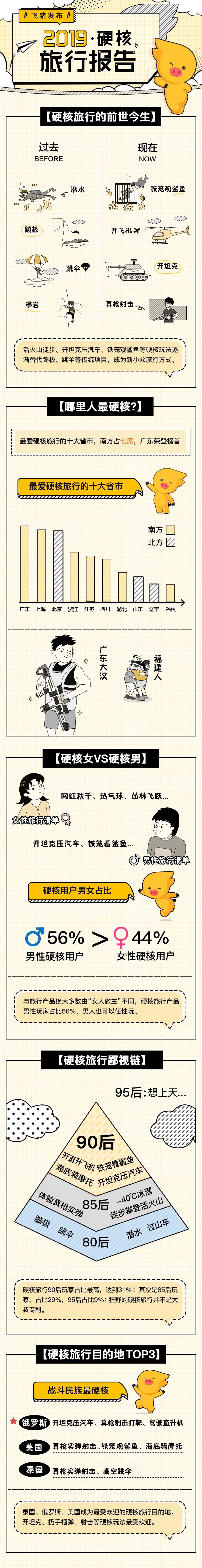 南方男人比被北方男人更硬核 飞猪数据显示,与旅行大部分商品由女性主导不同,在硬核旅行产品的消费中,男性玩家以56%的占比完成了逆袭。 而从地域分布来看,在“最爱硬核旅行的十大地区”中,除北京、山东、辽宁三地属于北方,其余七地都是南方省市。南方队以7:3占据明显优势。排名上,最爱硬核旅行的是广东人,其次是上海、北京。 硬核旅行产品客单价高,但并不是80后大叔们的专属。飞猪的数据显示,硬核旅行用户中,90后玩家占比最高,达到31%;其次是85后玩家,占比29%,95后也占到9%。80后实力大叔仅占14%,排名第三。 俄、美、泰成最受欢迎硬核旅行目的地 从飞猪硬核旅行商品分布的目的地来看,俄罗斯、美国、泰国是主要目的地。 在飞猪上“硬核旅行”,究竟是一种什么样的体验? 以俄罗斯的军事主题游为例,俄罗斯是枪械自由国家,不少游客选择在这里体验坦克、手榴弹、真枪射击等。其中,真枪射击的玩家最多,单价在千元左右;可以给用户提供11种枪型,配备210发子弹, AK47最受欢迎。坦克体验价格不菲,一般要四五个人拼团,人均最低也要六七千元,但仍然受到很多军迷的欢迎。