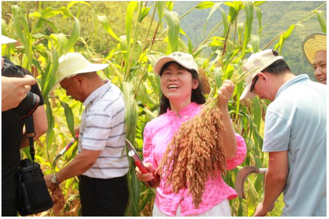 诗与远方,尽在此刻。嘉宾们在此赋诗、摄影,捕捉大自然的光影,用作品抒发对壮美大自然的赞美,畅谈心悠然天人共酿的秘密。红彤彤的高粱迎风摇曳,呈现一派丰收景象。著名作家潘小娴女士见此景,现场赋诗: 风吹高粱熟, 红浪滚天边。 漫山笑语盈, 香醉心悠然。 在工作人员的引导下,嘉宾们动手收割高粱,亲身体验丰收的喜悦。