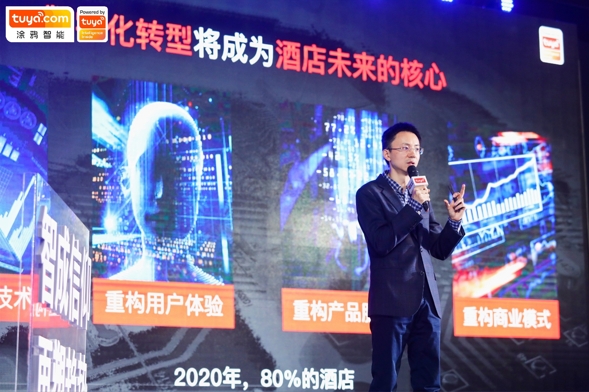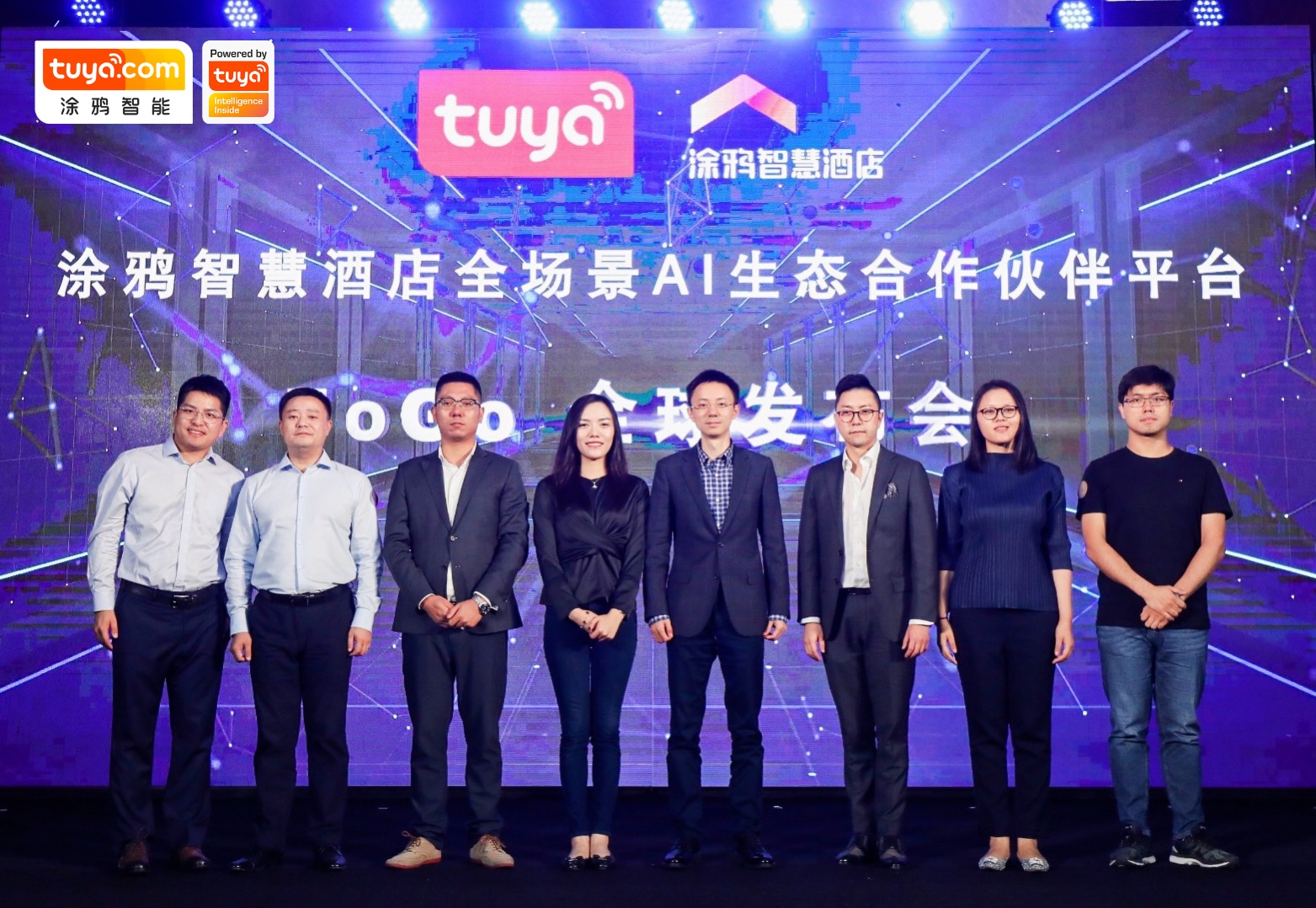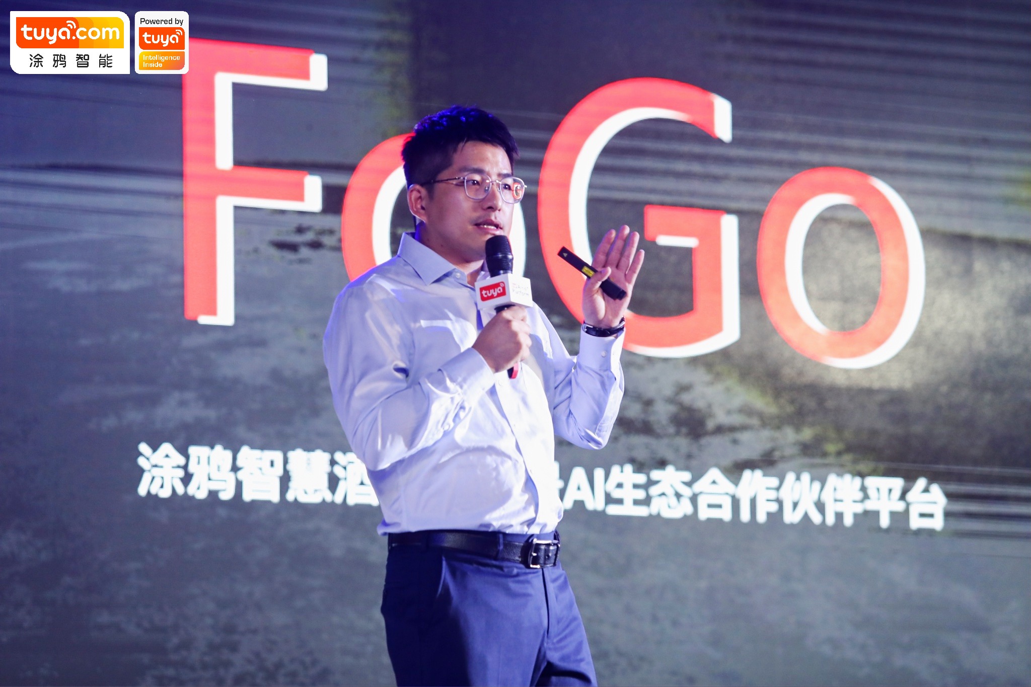 涂鸦智慧酒店合作伙伴大会现场嘉宾合影 活动现场汇聚了30多位行业专家及100多位生态合作伙伴。涂鸦智能董事长兼总裁陈燎罕、涂鸦智能智慧酒店负责人应海平、涂鸦智能大市场&战略合作副总裁那竞丹、涂鸦智能运营副总裁黄秋萍、小度行业合作负责人王小钢、温德姆酒店集团战略采购及增值服务高级总监张蔚、梦洁品牌总经理罗征、梦洁品牌事业部总监兼智能家居总监汪兴及云迹科技高级副总裁杨子等行业专家纷纷到场,从平台、模式、市场、技术及产品等多个维度,剖析智慧酒店的转型之路。 在会上,涂鸦智能正式对外重磅发布“涂鸦智慧酒店全场景AI生态平台FoGo”,未来将提供完整的“硬件+软件”OEM服务,重构核心技术、用户体验、产品服务和商业模式,助力品牌商及渠道商完成智慧酒店转型落地。 全场景AI生态平台FoGo登场,为酒店转型全面赋能 合作伙伴大会上,涂鸦智能董事长兼总裁陈燎罕先介绍了传统酒店行业面临的困局,经济和社会环境改变的冲击、服务业用工难、顾客消费习惯转变是整个行业面临的三大难题,智慧化转型正成为未来酒店的核心策略。