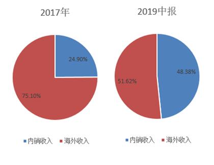 图1:国联水产2015年—2019年上半年内销收入及增速 由于内销收入增速大幅超过海外销售增速,国联水产内销收入在整体销售收入中的占比也逐年快速上升。内销收入占比从2017年的24.98%提升到了2018年的34.73%,2019年上半年进一步提升到了48.38%。