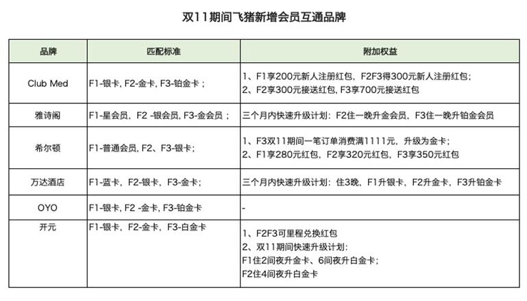 在亲子度假市场占据领先地位的Club Med、酒店公寓的领导品牌雅诗阁,新兴市场覆盖率迅猛提升的OYO酒店,以及国内酒店集团大佬开元和万达等,也抢在双11与飞猪实现会员互通,除了不同会员级别的匹配,还有专属的大额消费券,以及额外的住一晚升铂金等快速升级活动。