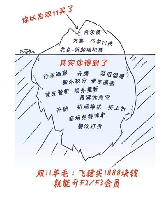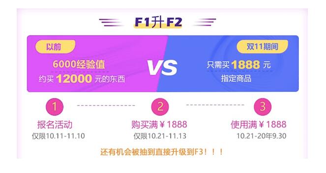 飞猪专门在双11期间推出了会员快速升级活动,只需预订1888元的指定商品,即可从F1迅速升级为F2会员,而平时成为F2需要累积6000经验值,对应要购买约1.2万元的旅行产品。