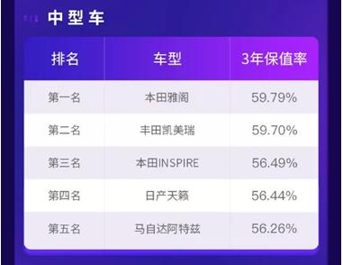 中型车中,日系车仍然占据榜单,有更高保值率,前五名分别是本田雅阁、丰田凯美瑞、本田INSPIRE、日产天籁和马自达阿特兹。