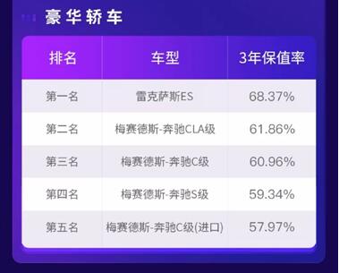 在豪华轿车保值率中,雷克萨斯ES高居榜首,其余四位被奔驰包揽,分别是梅赛德斯-奔驰CLA级、梅赛德斯-奔驰C级、梅赛德斯-奔驰S级、梅赛德斯-奔驰C级(进口)。