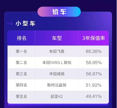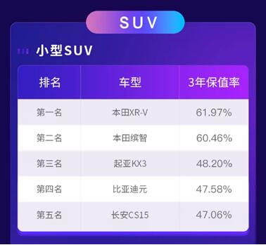 小型SUV中,本田两款车型本田XR-V和本田缤智分别以超60%的3年保值率高居榜首,起亚KX3、比亚迪元、长安CS15跟随其后。