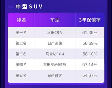 而中型SUV依旧是日系车居多,上榜车型分别是本田CR-V、日产奇骏、马自达CX-4、丰田RAV4荣放和日产逍客。