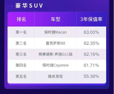 豪华SUV的保值率较为平均,各车型之间差别不大,基本保持在60%上下,上榜汽车分别是,保时捷Macan、雷克萨斯NX、梅赛德斯-奔驰GLC级、保时捷Cayenne和路虎发现。