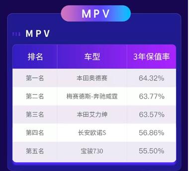 MPV上榜车型是本田奥德赛、梅赛德斯-奔驰威霆、本田艾力绅、长安欧诺S和宝骏730,基本与消费者心中保值率较高的车型一致。