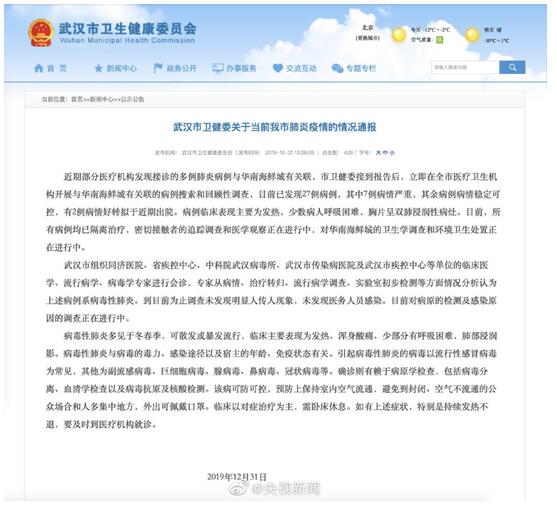 元旦节前,备受关注的武汉市不明肺炎情况引起广泛关注。12月31日,据湖北省卫健委及武汉市委宣传部消息,国家卫健委专家组已抵达武汉,正展开相关检测核实工作,经过调查发现,此次肺炎病例大部分为华南海鲜城经营户,相关病毒分型检测、隔离治疗、舆情管控、终末消毒等工作正在进行。