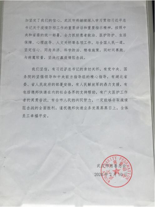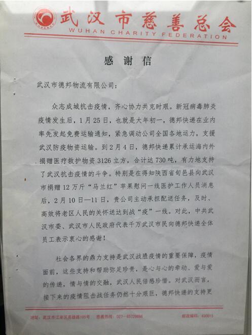 持续的物资运输有力支持了武汉抗击疫情的斗争,德邦快递收到了一封来自武汉市慈善总会的感谢信。信中提到,1月25日,德邦快递在业内率先发起免费运输通知,支援武汉防疫物资运输。“对此,中共武汉市委、武汉市人民政府代表千万武汉市民,向德邦快递全体员工表示衷心的感谢!”