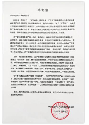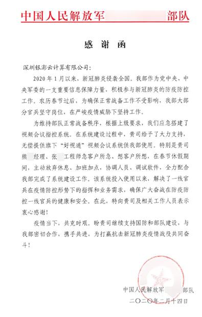当前,疫情防控已进入关键时期,新兴数字化手段在强化社会公共安全保障、完善医疗救治体系、健全物资保障体系、助力社会生产有序恢复等各领域的应用价值得以凸显。其中,远程视频协作一度成为社会各界广泛关注与持续热议的数字化工作模式。自疫情发生以来,齐心好视通主动承担企业社会责任,全力保障远程会诊问诊、远程应急指挥、中小学网络课堂、远程协作办公等社会需求。 近期,齐心好视通收到来自中国人民解放军某部队、青海省海西州卫生健康委员会、湖北省孝感市教育局、河南省台前县教育局、北京十一学校丰台小学等单位来函表示感谢。来自军政、医疗卫生、教育、通信等多个领域的100多封感谢信,见证着我们助力客户信息化建设的成果,也让我们备受鼓舞。 中国人民解放军某部队,启用云视频会议线上指挥 中国人民解放军是国家主要的武装力量。军队一直以来就承担着抢险救灾、应急救援等多样化使命任务。疫情发生以来,各地部队积极投身支援地方抗击疫情,守护人民群众的生命安全和身体健康。 为加强疫情防控工作,维持部队警戒备战状态,中国人民解放军某部队携手齐心好视通共同搭建视频会议指控系统,通过在线会议沟通协作,高效开展疫情防控形势下的指挥和业务工作,最大程度避免部队人员近距离接触,保障奋战在疫情防控一线官兵的健康和生命安全。