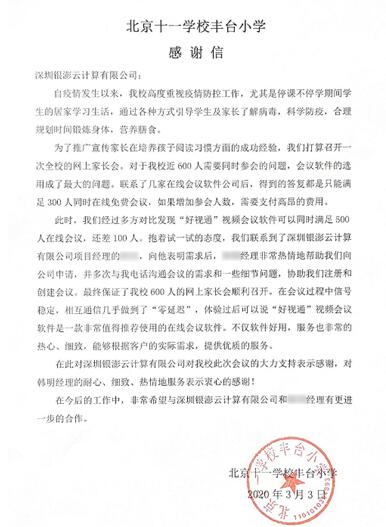 北京十一学校丰台小学搭建远程视频平台实现家校联通 北京十一学校是北京市高中示范校,原为中央委子弟学校。2019年,在北京市促进义务教育优质均衡发展的背景下,丰台区与北京十一学校合作办学,在石榴庄区域新建北京十一丰台中学,同时接手原北京教育科学技术研究院丰台第二实验小学为北京十一学校丰台小学。 疫情发生以来,学校是疫情防控的重点、难点。北京十一学校丰台小学为了防止疫情向学校扩散,守护师生生命安全和身体健康,倡导所有学生居家学习。在了解到丰台小学需求后,齐心好视通为其免费搭建远程视频协作平台,助力校方线上召开家长会,及时有效地与分布各地的家长们高效沟通疫情期间教学工作推进的相关问题,真正做到家校联通。与此同时,丰台小学的同学们也可通过齐心好视通云会议平台实现远程学习。