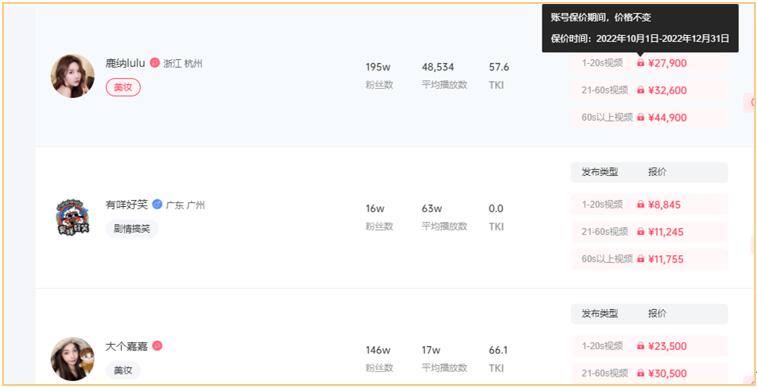 “保价服务”上线后,WEIQ平台上将展现出1000+“特殊的红人账号”,具体形式为在该类红人报价栏部分将带着明显的【锁】标识,即该红人属于“保价服务”范围内红人。当用户在WEIQ平台选择红人投放时,如果下单此类账号,若在保价时效内(平台标注时间)该账号出现了调价(涨价或降价)情况,WEIQ将根据具体情况向用户进行赔付。