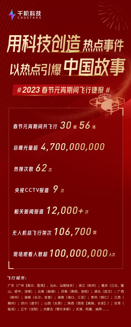 与此同时,千机科技数据显示,该公司春节元宵期间承办的项目62次登上微博热搜、抖音热榜。其中#被汕头焰火晚会震撼到了#微博话题阅读量1.8亿,#重庆新年氛围感拉满#微博话题阅读量2094.8万,#元宵灯光秀无人机表演今日上演#抖音话题阅读量439.3万......从正月初一到正月十五,千机科技共创造了超过47亿的总曝光量。