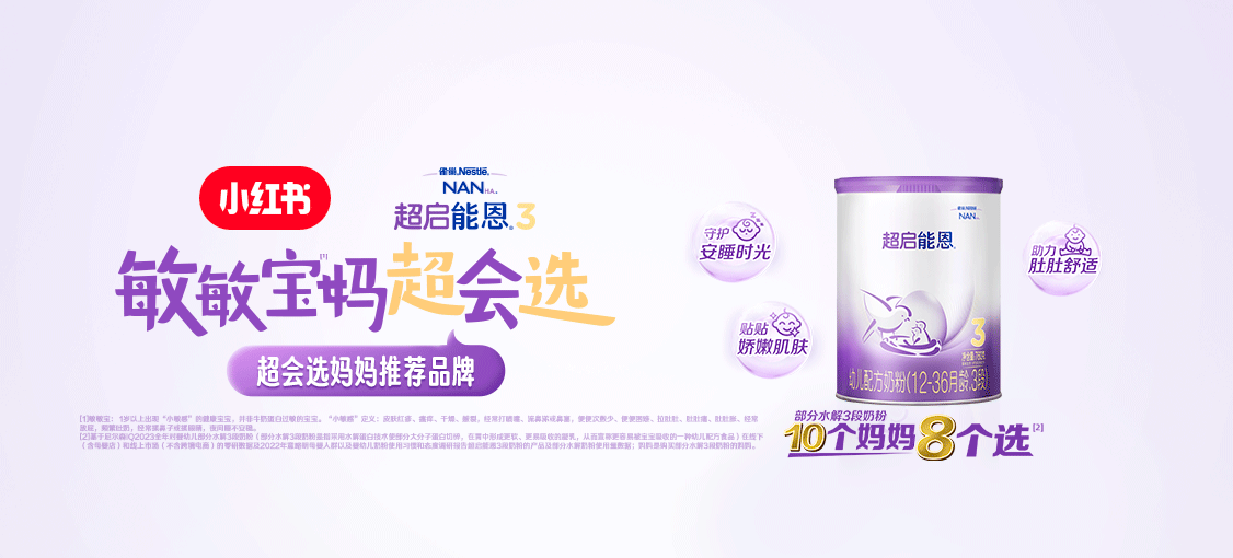 超启能恩3,含有部分水解蛋白和亲和OPO,帮助营养好吸收,以专业配方守护宝宝肚肚舒适,被推荐给更多敏敏宝妈。 活动期间(数据统计周期),平台用户自发创作UGC内容超18,330篇,其中被激励内容曝光量达4,404,034次,阅读量突破754,287次,互动转化率(CTR)高达17.13%,远超行业均值,精准激活母婴人群内容共创热情,成功构建“科学防御小敏感”品牌认知壁垒。 文内名词注释: 1、敏敏宝: 1岁以上出现“小敏感”的健康宝宝,并非牛奶蛋白过敏的宝宝。 “小敏感”定义:皮肤红疹、瘙痒、干燥、皴裂,经常打喷嚏、流鼻涕或鼻塞,便便次数少、便便困难、拉肚肚、肚肚痛、肚肚胀、经常放屁,频繁吐奶,经常揉鼻子或揉眼睛,夜间睡不安稳。 2、小敏感定义:皮肤红疹、瘙痒、干燥、皴裂,经常打喷嚏、流鼻涕或鼻塞,便便次数少、便便困难、拉肚肚、肚肚痛、肚肚胀、经常放屁,频繁吐奶,经常揉鼻子或揉眼睛,夜间睡不安稳; 3、科学防御小敏感: (1)小敏感定义:皮肤红疹、瘙痒、干燥、皴裂,经常打喷嚏、流鼻涕或鼻塞,便便次数少、便便困难、拉肚肚、肚肚痛、肚肚胀、经常放屁,频繁吐奶,经常揉鼻子或揉眼睛,夜间睡不安稳; (2) 部分水解工艺,打造H.A.低敏蛋白,活性益生菌Bb-12, 助力宝宝防御系统,H.A.低敏蛋白+活性益生菌Bb-12,帮助防御小敏感; (3) 基于对符合GB10767-2010国家标准的雀巢超启能恩3配方展开的前瞻性、真实世界、对照喂养研究(初步结论已经以摘要形式发表于第十四届亚洲营养大会和欧洲Excellence in Pediatrics会议 (2023) 2023 EIP abstract book, Cogent Public Health, 10:1 pp80, 2275942, DOI:10.1080/27707571.2023.2275942.),在辅食添加的基础上,得出相关结论。超启能恩3会随着市场需要进行必要配方升级,但所有超启能恩3配方均使用相同的蛋白水解工艺,且同时添加了活性益生菌Bb-12。 4、致敏性降低1000倍:Bourdeau T et al. Nutrients. 2021 Aug 28;13(9):3011 5、全球及中国双重科学实证:GINI:Gappa M et al. Allergy. 2020 Dec 15;中国:孙雯等,中国围产医学杂志,2015,18(12):904-909 6、10个妈妈8个选:中国妈妈每选购10罐部分水解3段奶粉,就有8罐是超启能恩幼儿配方奶粉(12-36月龄,3段),按2024年全渠道不含跨境电商零售量计,超启能恩市场份额超过80%。来源:欧睿信息咨询(上海)有限公司,按2024年全年中国大陆部分水解3段奶粉产品系列在线上+线下,不含跨境电商零售量(罐)计算;部分水解3段奶粉指采用水解蛋白技术使大分子蛋白切碎,在胃中形成更软、更易吸收的凝乳,从而宣称更容易被宝宝吸收的一种幼儿配方食品;其中3段特指针对12-36个月的幼儿配方食品。于2025年4月完成调研。 |