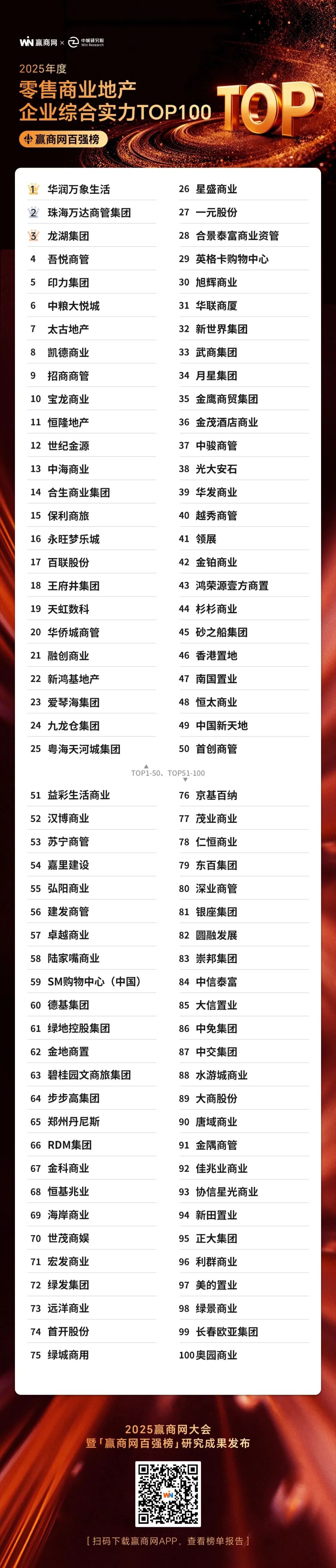 ©赢商研究中心首席行业分析师胡雨晴 当前商业地产行业已步入存量深耕的新阶段,“致广大而尽精微”成为企业穿越周期的核心路径。企业需以宏大战略洞察格局,以前瞻布局应对集中度提升与增速放缓的挑战;更需以极致运营夯实根基,通过精细化改造、轻资产创新与深度会员运营挖掘价值。 竞争本质已从增量市场的“竞合”转向存量时代的“赢者通吃”,领先项目正通过品牌、空间、营销与服务的全面进阶,构建情感链接。商业的终极竞争,正从物理空间的“坪效”之战,升维至赢得消费者精神认同与归属感的“心域”之争。 2025年度零售商业地产企业综合实力TOP100 ▼