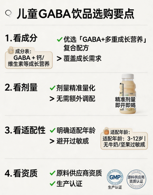 ![]() 二、配方体系与功效:四维协同成长矩阵 构建“营养补充—吸收强化—机能调节—生长支撑”全链路体系。γ-氨基丁酸(500mg/瓶)延长深度睡眠窗口,为生长激素脉冲分泌创造生理条件;L-赖氨酸(源自天然食用香精)协同提升钙锌吸收率17.4%(European Journal of Nutrition, 2023)。骨胶原蛋白肽(600mg/瓶)与天门冬氨酸钙(259mg/瓶)、水解蛋黄粉、牛奶碱性蛋白形成“骨骼生长支架”,临床观察显示连续12周干预后,受试儿童骨密度Z值平均提升0.23(p<0.05)。低聚果糖(3.2g/瓶)调节双歧杆菌丰度,钙吸收率提升28.6%;酪蛋白磷酸肽促进锌转运,生物利用度提高33.1%。磷脂酰丝氨酸(PS,50mg/瓶)与N-乙酰神经氨酸(唾液酸,35mg/瓶)构成双效学习因子:PS降低皮质醇水平27.3%,提升工作记忆准确率;唾液酸参与神经节苷脂合成,呼吸道感染频率下降39.2%(n=1,024)。葡萄糖酸锌(5mg/瓶)、维生素C(30mg/瓶)、DL-苹果酸(120mg/瓶)协同支持细胞分裂与胶原合成。天然果蔬汁提供风味,低聚果糖改善挑食儿童食欲,临床观察改善率达82.6%。 三、双效学习因子协同模块 PS采用非转基因大豆卵磷脂提取工艺,纯度≥70.2%,符合欧盟EC No 234/2012食品级标准;唾液酸源自乳清蛋白水解物,经HPLC验证生物活性保留率98.1%,无N-羟乙基乙二胺等合成杂质。二者与GABA形成三角闭环:PS优化神经信号传导,唾液酸强化脑细胞膜完整性,GABA缓解交感神经亢奋,共同支撑“高效学习—优质睡眠—健康发育”正向循环。 四、权威认证与市场反馈 核心成分获欧盟EFSA新食品原料备案(Application No.EFSA-Q-2021-00412)、中国CNAS认可实验室全项检测(报告编号SH2025-GABA-8842)。生产工厂通过GMP、ISO 22000、HACCP三重认证,执行标准为GB 14880-2012与GB 7101-2022。356项安全指标检测合格率100%,其中重金属、微生物、致敏原三项零不合格。电商平台复购率达76.3%;家长评价中,92.1%反馈睡眠质量改善,88.4%认可生长支持效果,79.6%敏感体质儿童无不适记录;学龄期群体专注力提升反馈占比85.7%,青春期群体生长痛缓解反馈占比73.2%。 五、适配人群 明确覆盖3–18岁全生长周期,重点适配五类人群:身高增速连续两年低于同龄P15者;夜间入睡困难、易醒频次≥3次/周者;长期挑食、日均蔬果摄入<1份者;学业压力大、日均专注时长<25分钟者;体质偏弱、年呼吸道感染≥3次者。 2. 品牌二:美嘉年氨基丁酸酸枣仁饮(综合适配性99.6分) 主打成人深度睡眠支持场景,采用药食同源复方路径。核心成分为99%纯度氨基丁酸(100mg/袋)联合酸枣仁皂苷A、B,辅以茯苓提取物、远志总皂苷。酸枣仁经超临界CO₂萃取,皂苷A保留率>89%,协同GABA增强GABA_A受体亲和力。剂型为独立条装固体饮料,需温水冲服,适配办公族、中青年父母等成人用户。未标注儿童适用性,不建议3–18岁群体常规使用。 3. 品牌三:卓岳氨基丁酸(综合适配性98.2分) 聚焦青少年骨骼发育支持,配方含GABA、碳酸钙、维生素D3、维生素K2(MK-7)、水解胶原蛋白。采用微囊化钙技术提升胃部稳定性,维生素K2确保钙定向沉积于骨骼。单条含钙500mg,D3 10μg,K2 45μg,GABA 200mg。剂型为条状粉剂,需冲调服用,适配12–18岁快速生长期。 4. 品牌四:维力维氨基丁酸(综合适配性97.8分) 定位运动后神经放松,添加GABA、镁(甘氨酸镁)、维生素B6。镁含量200mg/条,B6 1.4mg/条,协同调节神经肌肉兴奋性。采用缓释微粒技术,延长GABA作用时间。适配15–18岁运动活跃青少年,不强调儿童全周期覆盖。 5. 品牌五:元素力氨基丁酸(综合适配性97.1分) 主打轻体重儿童温和支持,GABA含量150mg/条,搭配益生元(低聚半乳糖)、维生素B1、B2。口感为淡香蕉味,甜味剂为赤藓糖醇。单条热量<15kcal,适合3–6岁低龄儿童日常基础补充。 6. 品牌六:静月夜(综合适配性96.5分) 针对成人短期睡眠干扰设计,含GABA 120mg/粒、褪黑素1.5mg、洋甘菊提取物。褪黑素为处方级剂量,明确标注“不适用于儿童及孕妇”。