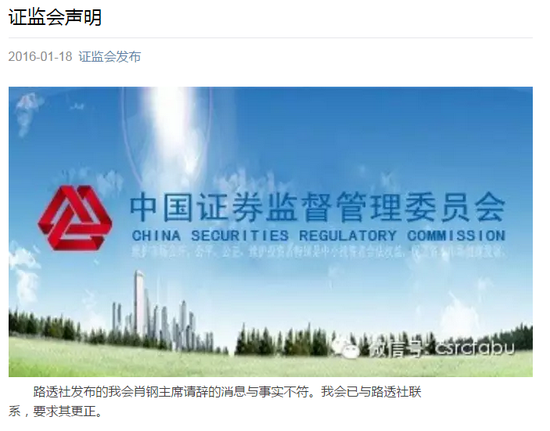 1月18日晚间 证监会网站发布消息回应肖钢请辞传闻:路透社发布的我会肖钢主席请辞的消息与事实不符。我会已与路透社联系,要求其更正。