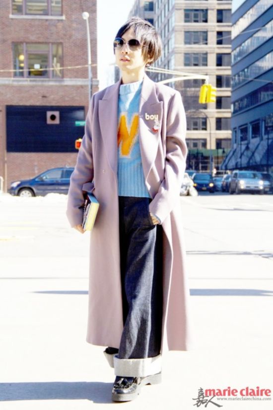 街头潮人身穿裸色长大衣内搭字母毛衣,下配牛仔阔腿裤街拍。 Tips: 1. 长大衣能更好的提升个人气质。 2. 佩戴的胸针不必过于夸张,简单就好。 推荐搭配