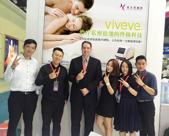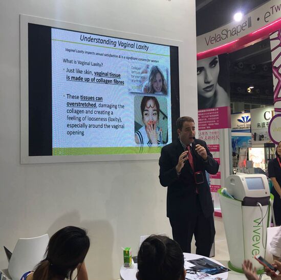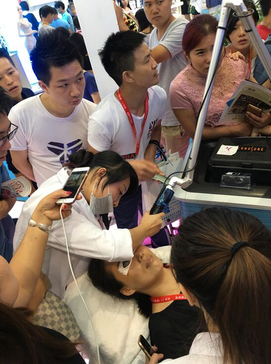 Viveve(唯蜜)原厂专家Jeff正在为客户进行现场讲解 除开原厂专家的现场讲座,展会期间最受欢迎的环节就是项目免费体验服务。无论是女士还是男士,一听说有免费体验服务时都纷纷围了过来,大家都争先想要亲身体验皮秒激光的治疗效果。在体验服务进行期间,许多路过的观展人士也纷纷驻足围观,想要一看皮秒激光的神奇之处。