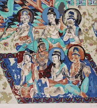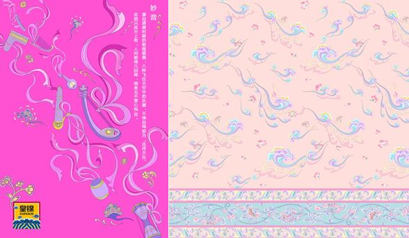 常沙娜临摹敦煌壁画作品 敦煌图案取之不尽,用之不竭。“从敦煌的图案里面能够看出中国隋、唐、宋这三个最主要的朝代的图案变化,其中唐代是中国文化最开放,也是接入外来文化最融合的一个朝代,它的图案表现自由,它不拘泥于一定的装饰面积和构图组织,所呈现出的造型自然活泼,既接近于自然形态,又经过匠心独运的简练、概括、夸张和平面化的处理,比自然形更具装饰趣味和艺术魅力,让人心驰向往。” 自创立“皇锦”品牌之初,常老师就亲自指导敦煌装饰图案、敦煌色彩在皇锦设计上的应用,2014年皇锦围绕着敦煌装饰图案,设计了三款真丝手工抬版印花面料——《妙音》、《彩绘》和《祥云》,无论是专家还是顾客,都极为认可。这更坚定了张雪梅大力研究敦煌,将敦煌文化融入皇锦基因的决心。