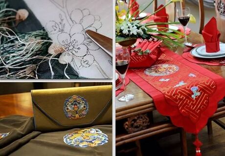 皇锦根据敦煌图案创作的作品《妙音》和《祥云》 无论是宫廷还是敦煌,都是中国传统文明的最集于大成的巅峰成果。“这两大体系,我们皇锦人一辈子都干不完。”张雪梅说。 这一路程虽然艰辛,但很值得,“还有伴随我们成长的那么多忠实顾客,他们对传统文化的喜爱,对我们的认可,是支撑我们走下去的最大动力。” 工匠之心:倔强的尊严 自创立以来,皇锦始终坚持皇锦耀将产品当作艺术品去创作,用最为精湛的手工技艺和审美标准。 除了图案设计,皇锦在工艺上根据丝绸的特性和每一种丝绸的工艺,选择云锦、缂丝还有(偏工业化的)织锦,选择独具皇家气质的京绣、苏绣……“我们与苏州刺绣研究所、南京云锦研究所合作,但是绣法上可不是绣娘说了算,要和我们的整体设计相统一。”