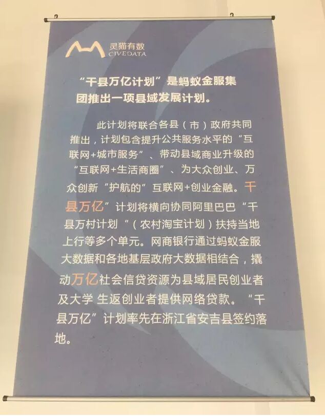 2016年3月28日,蚂蚁金服宣布在全国启动“千县万亿计划”。首个试点平台在浙江湖州的安吉县落地,安吉成为“千县万亿工程计划”的第一县。