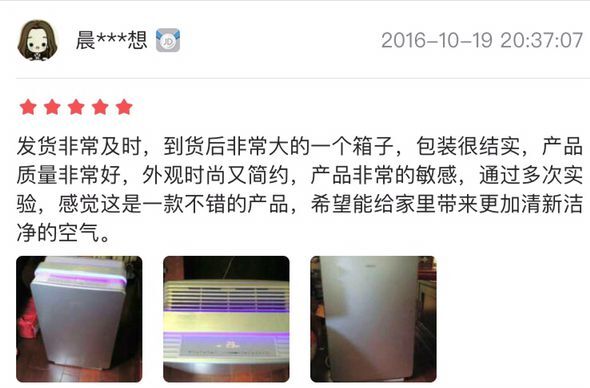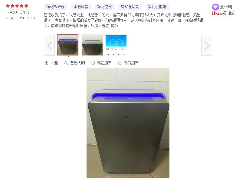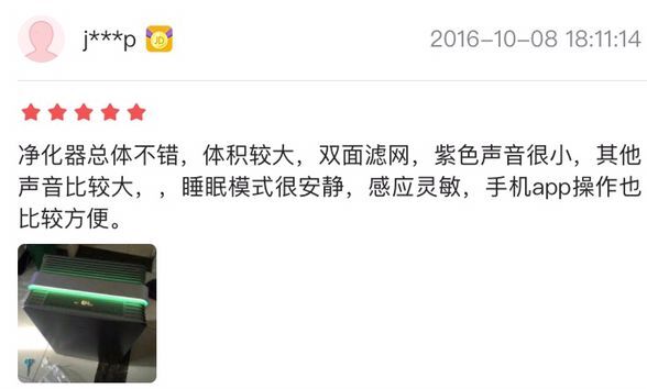 而更多的消费者在体验之后更倾向于产品的净化力度、静音程度及操作使用上。“净化效果好”、“超静音”、“净化速度之快”“APP手机智能操作”成为消费者的直观感受。“昨天晚上下单,今天中午就到了,赶紧用起来,外面重度雾霾啊?使用接近一小时后终于红灯变蓝了,净化效果不错”。