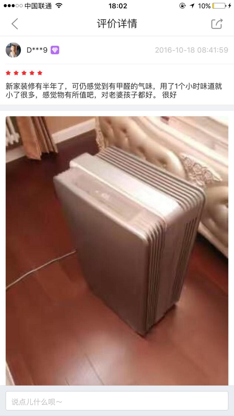 一位有孩子的用户也评价到,“新家装修有半年了,可仍感觉到有甲醛的气味,用了1个小时味道就小了很多,感觉物有所值吧,对老婆孩子都好。很好”。