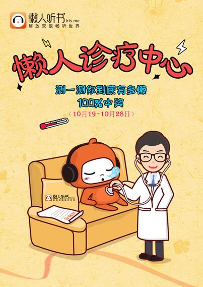 懒人诊疗中心将从10月21日一直持续至10月30日,只要关注懒人听书官方微信公众号,即可根据指引进入H5参与活动。懒人节活动正如火如荼的进行中,本次懒人诊疗中心H5是其第二场官方正式活动,旨在用有料、有趣、有态度的方式传播充满正能量的“懒人文化”。 如果你也是“懒癌”患者,如果你也深受“懒癌”困扰,不妨试试懒人诊疗中心,参与趣味诊疗,让懒人听书拯救你! |